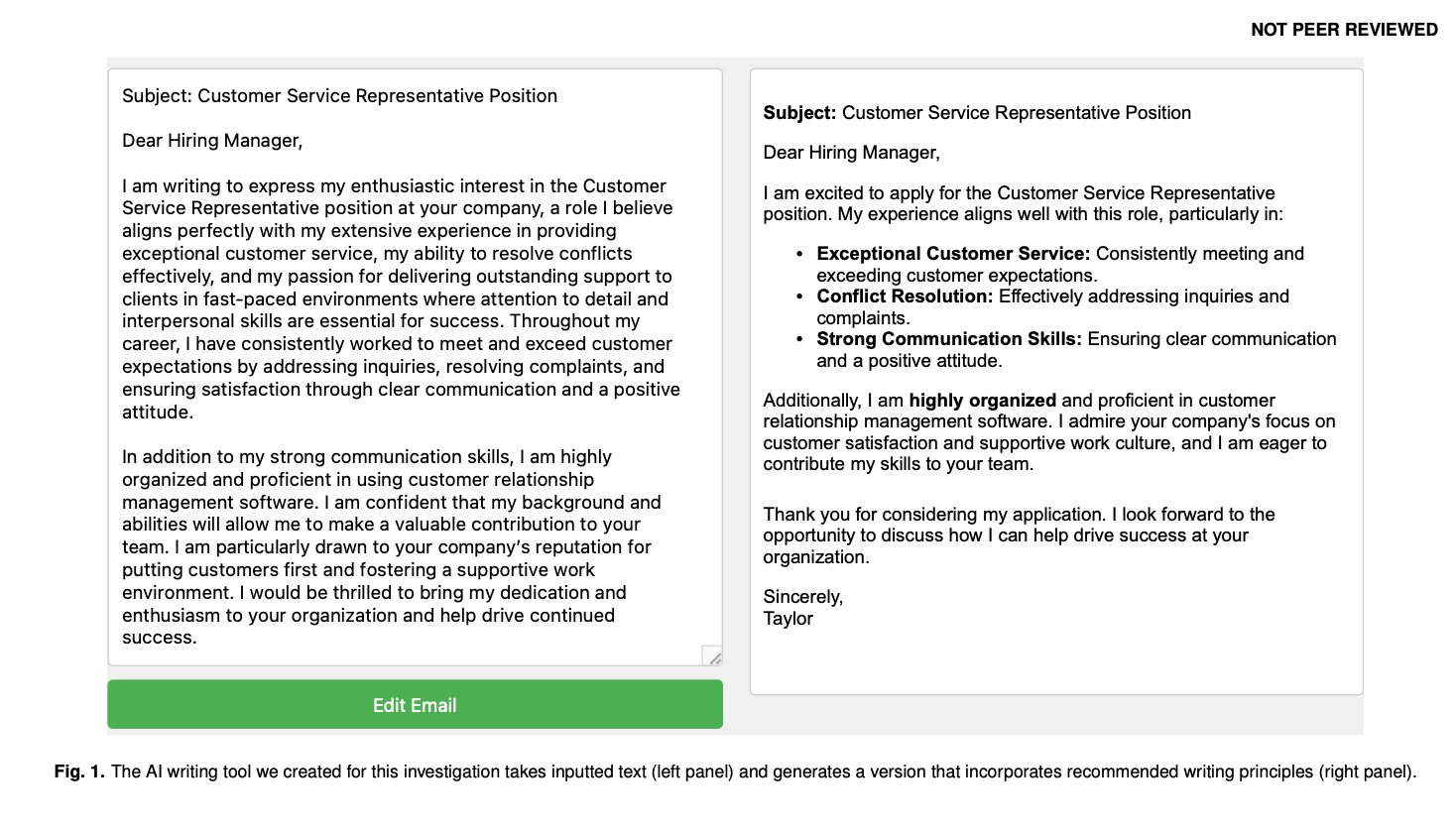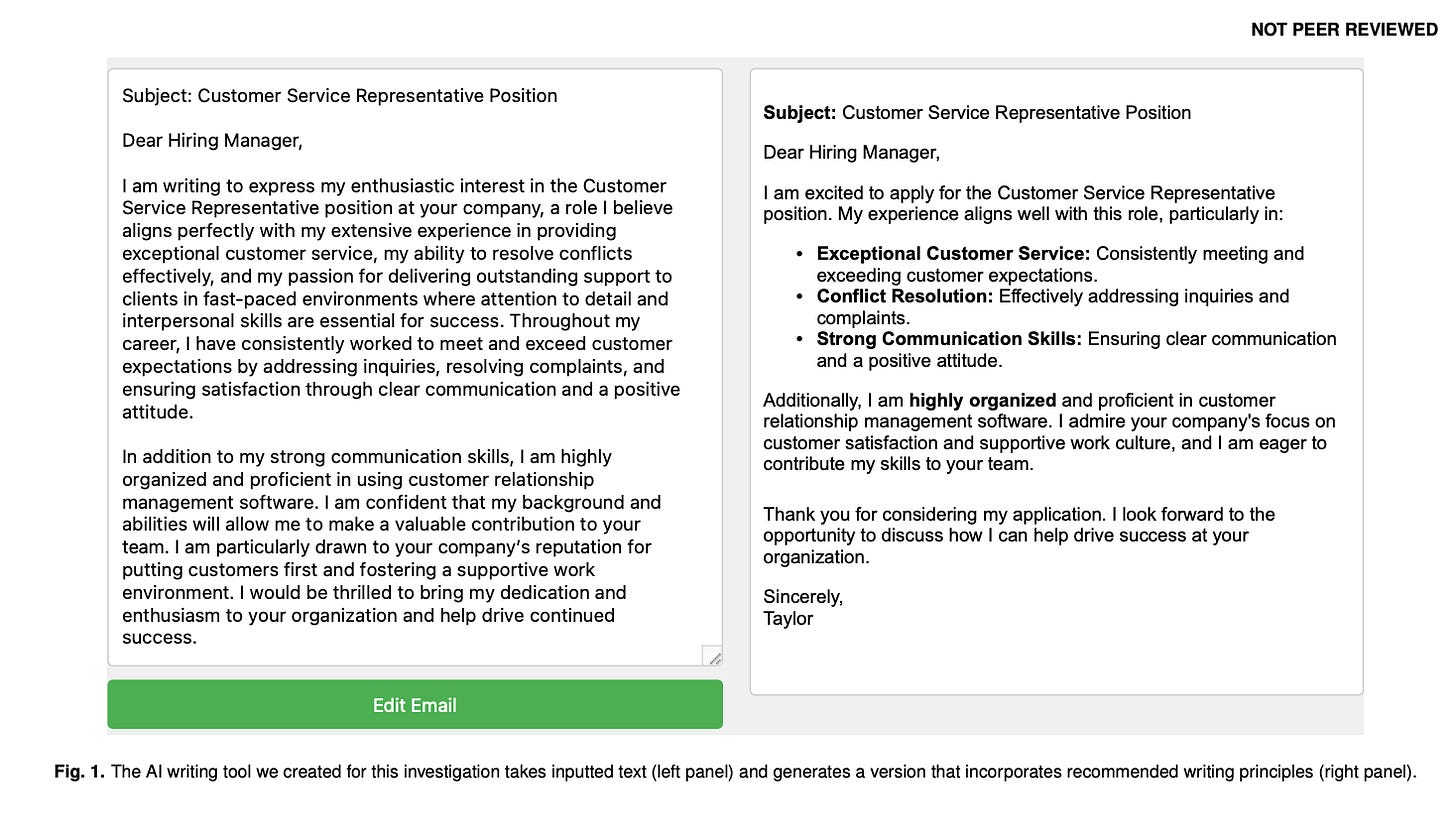 Simply saw an AI-generated “ideal” version – In the “example-only” condition, instead of practising, they were just shown a high-quality AI rewrite of the letter (not labelled as AI) and asked to study it; they didn’t type or edit anything during practice.
