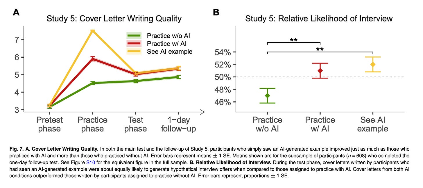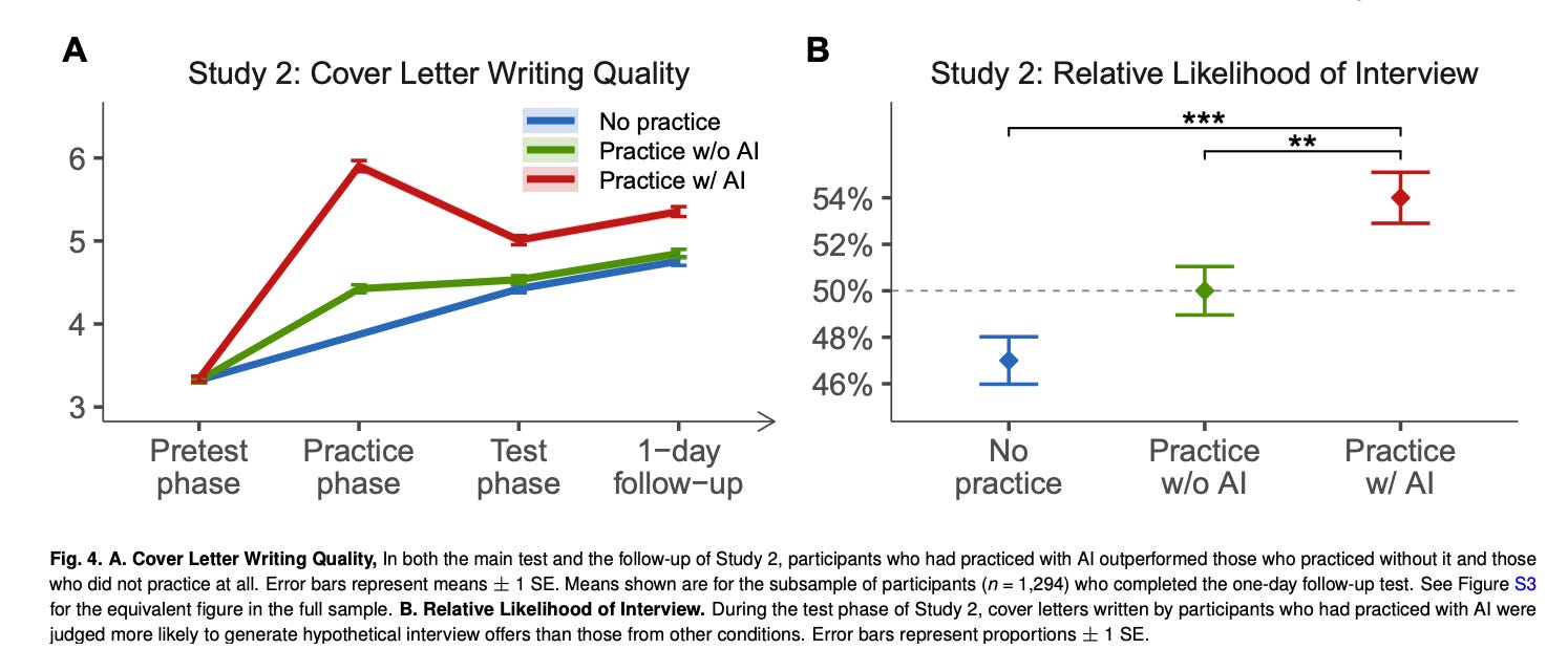 Perhaps the most surprising result comes from the final study. Alongside the “Practise with AI” group and “Practise without AI” group, the researchers added a third condition where participants didn’t write anything at all during practice – they just looked at a high-quality, AI-generated rewrite of the cover letter.