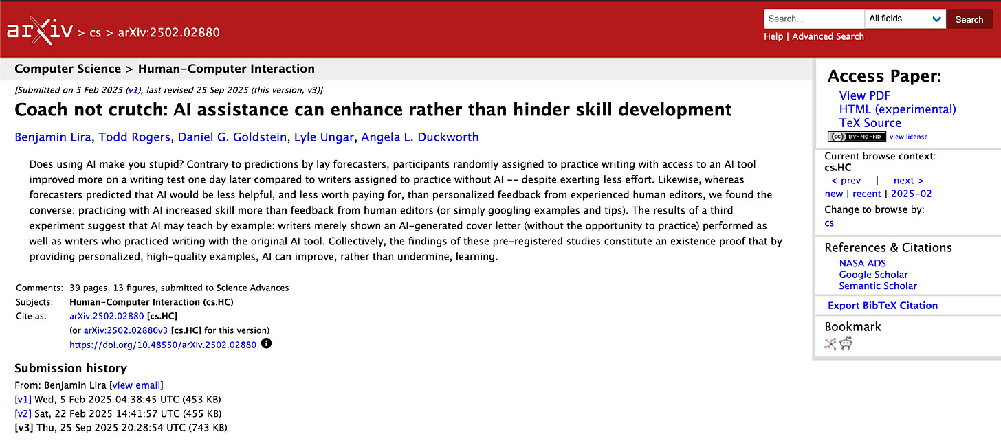 A new paper, “Coach not crutch: AI assistance can enhance rather than hinder skill development” (Lira et al., 2025), gives one of the clearest answers yet – and it’s both more optimistic (and more nuanced) than previous research has suggested.