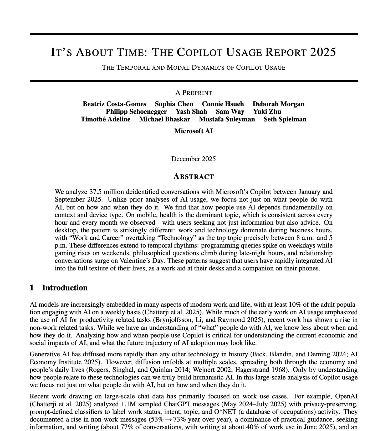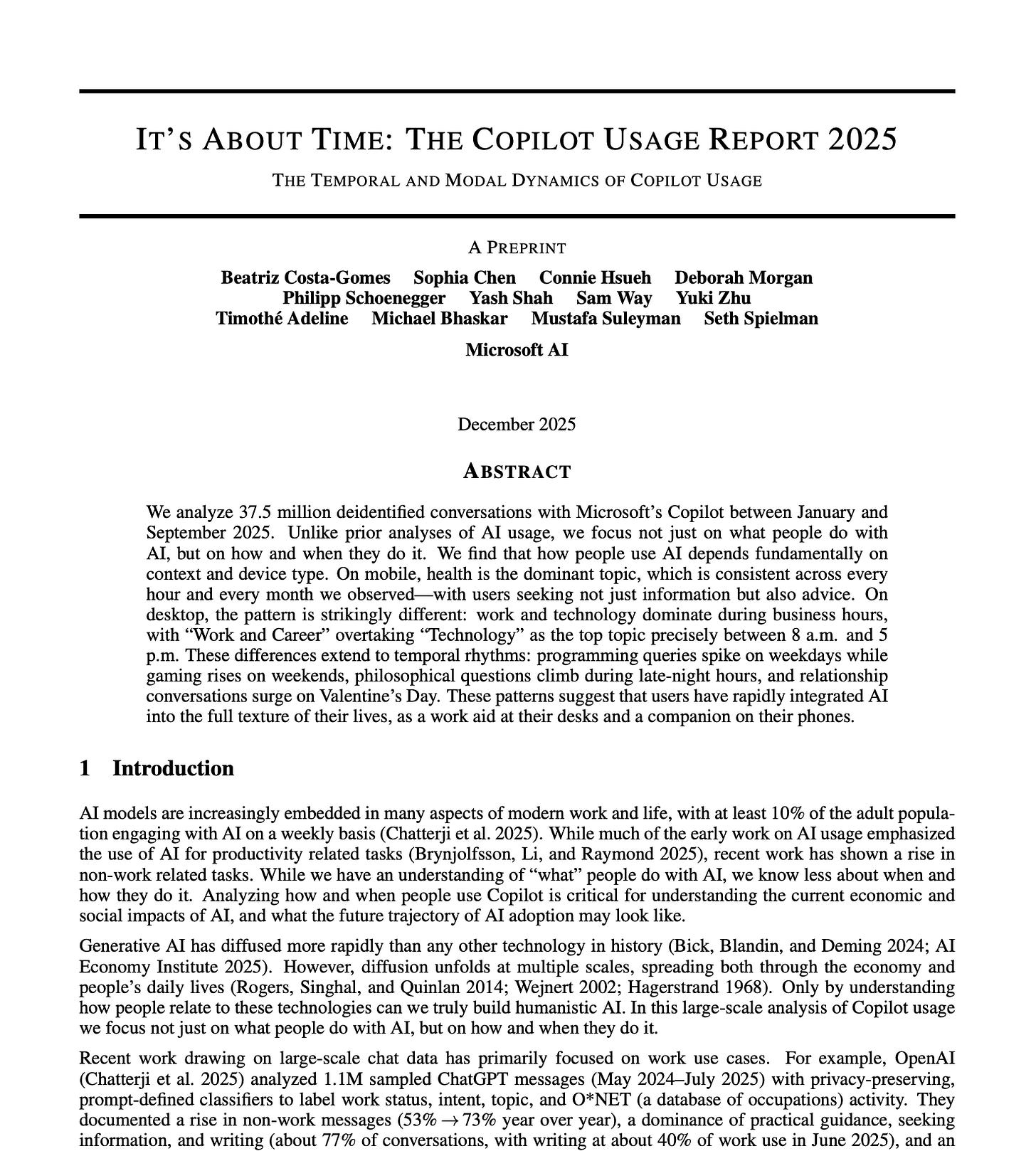 The Copilot report analyses 37.5 million de-identified conversations from consumer users—not enterprise or education accounts. Each interaction gets classified by intent (learning, searching, getting advice, creating), topic domain (maths & logic, science, language learning), device type (desktop vs mobile), and timing (time of day and month).